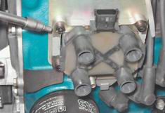 8. Подсоединяем поочередно щупы омметра к высоковольтным выводам катушки 1-4 и 2-3 и замеряем сопротивление вторичных обмоток. У исправной катушки оно должно быть в пределах 5,0-6,0 кОм. 9. Для проверки замыкания первичных обмоток на "массу" подсоединяем щупы омметра к среднему выводу "15" разъема и к металлической части корпуса катушки. Если сопротивление стремиться к бесконечности, замыкания нет. 10. Для проверки на обрыв цепей первичных обмоток подсоединяем щупы омметра к крайним выводам "1а" и "1b" разъема катушки. Если сопротивление стремится к бесконечности, значит, в цепи произошел обрыв и катушку необходимо заменить. 11. Для снятия катушки зажигания шестигранным ключом на 5 мм отворачиваем четыре винта крепления и снимаем катушку.