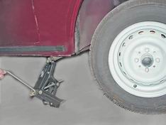 4. Устанавливаем подъемный рычаг домкрата в гнездо кронштейна, расположенного под днищем кузова, и вращаем рукоятку домкрата по часовой стрелке до тех пор, пока колесо не окажется приподнятым над поверхностью дороги.