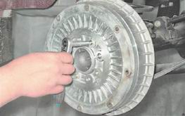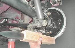 6. Равномерно поворачивая тормозной барабан и нанося удары молотком через деревянный брусок по фланцу с внутренней стороны, сбиваем барабан.