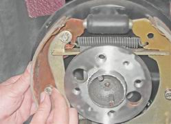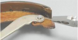 15. Отсоединяем от колодок распорную планку и стяжную пружину. 16. Пассатижами извлекаем шплинт из оси распорного рычага.