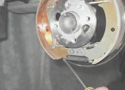 10. Снимаем две чашки с пружиной и стойкой. Аналогично снимаем детали опорной стойки с другой колодки. 11. Поддев отверткой, снимаем нижнюю стяжную пружину.