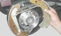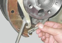 17. Снимаем с колодки шайбу, рычаг и ось. Установка 1. Раздвижными пассатижами сдвигаем внутрь поршни рабочего цилиндра. 2. Устанавливаем снятые детали привода стояночного тормоза на новую тормозную колодку в обратной последовательности. 3. Ориентируем распорную планку двойной прорезью к задней колодке. 4. После установки тормозного барабана несколько раз резко нажимаем педаль тормоза для того, чтобы упорные кольца в колесном цилиндре заняли свое рабочее положение. 5. Аналогично заменяем колодки с противоположной стороны автомобиля. 6. Регулируем стояночный тормоз (см. "Стояночный тормоз - регулировка"). |