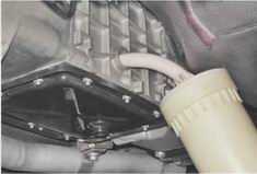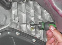 При сильном падении уровня масла проверяем состояние сальников валов коробки передач. He допускается наличие капель масла на картере, но допустимо масляное отпотевание, которое не является признаком повреждения сальников. Проверяем крепление крышек картера коробки передач и, в случае необходимости, подтягиваем гайки. Если течь масла не прекращается, заменяем прокладки и/или сальники (см. "Коробка передач - разборка и сборка"). Замена масла Для выполнения работы потребуется емкость для сбора отработанного масла объемом не менее 2 л. Масло следует заменять сразу после поездки, горячее масло быстрее и полнее сливается вместе со взвешенными в нем частицами. Внимание! Температура масла может достигать 90°С, будьте осторожны. 1. Отворачиваем пробку заливного отверстия (см. выше). 2. Подставляем под сливное отверстие емкость. 3. Шестигранником на 12 мм отворачиваем пробку сливного отверстия.