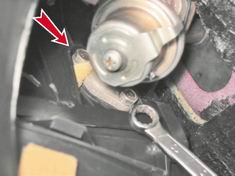6. Отсоединяем правый воздуховод от кожуха радиатора (см. "Электродвигатель вентилятора отопителя - замена"). 7. Торцовым ключом на 7 мм ослабляем болт крепления тяги привода крана отопителя.