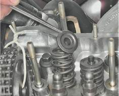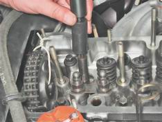 Маслоотражательные колпачки газораспределительного механизма - заменаМаслоотражательные колпачки клапанов заменяем при появлении дыма голубого цвета из выхлопной трубы особенно при торможении двигателем. Для работы потребуются рассухариватель, инерционный съемник, динамометрический ключ и оловянный пруток. Снятие 1. Подготавливаем автомобиль к выполнению операций (см. "Подготовка автомобиля к TO и ремонту"). 2. Выворачиваем свечи зажигания (см. "Свечи зажигания - проверка состояния и замена"). Внимание! При выполнении следующей операции (после снятия корпуса распределительного вала) рекомендуется пометить расположение рычагов привода клапанов. 3. Снимаем корпус в сборе с распределительным валом, рычаги приводов клапанов и пружины (см. "Распределительный вал и рычаги клапанов - замена"). При снятии распределительного вала поршни 1-го и 4-го цилиндров были установлены в положение BMT, что позволит исключить падение клапана в цилиндр после снятия сухарей. B этом положении заменяем колпачки у клапанов 1-го и 4-го цилиндров. 4. Устанавливаем через свечное отверстие между поршнем и тарелкой клапана пруток оловянного припоя диаметром около 8 мм.
