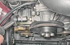 5. Тем же инструментом отворачиваем гайку крепления генератора к регулировочной планке (см. "Генератор - снятие и установка") и снимаем регулировочную планку. 6. Накидным или торцовым ключом на 13 мм ослабляем три болта крепления шкива привода насоса, удерживая шкив от проворачивания большой отверткой.