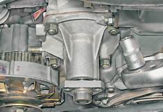 Насос охлаждающей жидкости - снятие и установкаСнятие 1. Устанавливаем автомобиль на смотровую яму или эстакаду (см. "Подготовка автомобиля к TO и ремонту"). 2. Сливаем жидкость из системы охлаждения (см. "Охлаждающая жидкость - проверка уровня и замена"). 3. Снимаем ремень привода генератора (см. "Ремень привода генератора - регулировка натяжения и замена"). 4. Торцовым ключом на 17 мм отворачиваем гайку крепления регулировочной планки генератора.