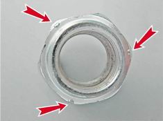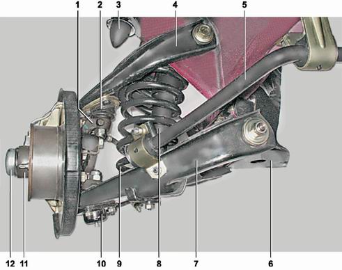 Детали передней подвески: 1 - поворотный кулак (2101-3001014/15); 2 - верхняя шаровая опора (2101-2904192-01); 3 - буфер хода сжатия (2101-2904230); 4 - верхний рычаг (2101-2904100/01); 5 - стабилизатор поперечной устойчивости (2101-2906010); 6 - поперечина передней подвески (2101-2904200); 7 - нижний рычаг (2101-2904020-01/21-01); 8 - амортизатор (2101-2905402-05); 9 - пружина (2101-2902712); 10 - нижняя шаровая опора (2101-2904082); 11 - ступица с подшипниками (2101-3103002); 12 - колпак ступицы (2101-3101065)Передняя подвеска - независимая на двойных поперечных рычагах. Переднее колесо соединено четырьмя болтами со ступицей, установленной на двух роликовых конических подшипниках. Подшипники установлены в ступице и зафиксированы гайкой. Гайка крепления ступицы правого колеса имеет левую резьбу и маркировку в виде трех точек.