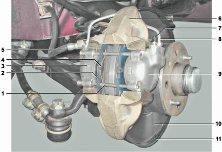 Тормозной механизм переднего колеса: 1 - направляющий палец колодок (2101-3501132); 2 - тормозная колодка (2101-3501089); 3 - рабочий цилиндр внутренний (2101-3501182/83); 4 - прижимная пружина колодок (2101-3501035); 5 - шланг тормозного механизма переднего колеса (21061-3506060); 6 - суппорт (2101-3501016/17); 7 - штуцер прокачки тормозного механизма переднего колеса (2101-1602591); 8 - соединительная трубка рабочих цилиндров (2101-3501086-01/85-01); 9 - рабочий цилиндр наружный (2101-3501180/81); 10 - тормозной диск (2101-3501070); 11 - защитный кожух (2101-3501146/47)