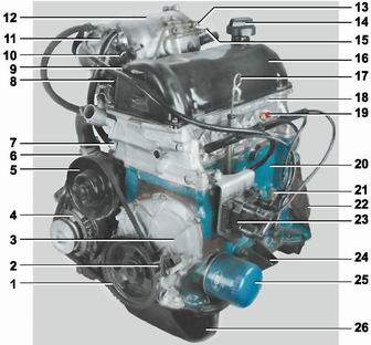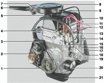 Карбюраторный двигатель: 1 - шкив коленчатого вала; 2 - генератор; 3 - насос охлаждающей жидкости; 4 - термостат; 5 - карбюратор; 6 - воздухозаборник; 7 - терморегулятор; 8 - корпус воздушного фильтра; 9 - пробка маслозаливной горловины; 10 - крышка головки блока цилиндров; 11 - распределитель зажигания; 12 - головка блока цилиндров; 13 - датчик указателя температуры охлаждающей жидкости; 14 - блок цилиндров; 15 - маслоотделитель системы вентиляции картера; 16 - датчик давления масла; 17 - маховик; 18 - топливный насос; 19 - крышка привода распределительного вала; 20 - масляный фильтр; 21 - поддон картера двигателя