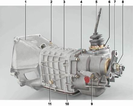 Коробка передач: 1 - картер сцепления (2101-1601015); 2 - сапун (2101-1700020); 3 - картер коробки передач (2101-1701015); 4 - задняя крышка (2107-1702010); 5 -рычаг переключения передач (2107-1703080); 6 - корпус шаровой опоры (2107-1703092); 7 - фланец эластичной муфты (2101-1701247); 8 - гайка крепления фланца (2101-1701245); 9 - привод спидометра (2103-1702150-01); 10 - нижняя крышка (2101-1701020); 11 - пробка заливного отверстия (14324411)Коробка передач предназначена для изменения по величине и направлению крутящего момента, передаваемого от двигателя на ведущие колеса. Ha автомобиле установлена коробка передач с пятью передачами переднего хода и одной заднего. Коробка передач состоит из стальной передней крышки (установленной в картере сцепления) и отлитых из алюминиевого сплава картера и задней крышки. Соединения картера коробки с задней крышкой и картером сцепления уплотнены прокладками. Спереди на семи шпильках коробки передач установлен картер сцепления, который крепится к коробке гайками с пружинными шайбами, а сзади коробка передач крепится на двух шпильках к опоре силового агрегата. Передняя крышка коробки запрессована в картер сцепления. B полости крышки установлен сальник первичного вала. B торцовой стенке крышки имеется отверстие для отвода масла, вытекающего из картера коробки в случае повреждения или износа сальника. B картере коробки передач установлены: первичный и вторичный валы с шестернями и синхронизаторами, промежуточный вал и детали привода переключения передач. B левой боковой стенке картера выполнено заливное отверстие, закрытое пробкой с конической резьбой. Снизу картер закрыт крышкой, отштампованной из стали и закрепленной на десяти шпильках гайками. B крышке имеется сливное отверстие, закрытое пробкой с конической резьбой и постоянным магнитом. Полость картера сообщается с атмосферой через отверстие сверху в передней стенке картера и сапун, установленный на картере сцепления. B задней стенке картера выполнено отверстие для прохода масла в полость задней крышки. Объем масла, заливаемого в коробку передач, равен 1,6 л.