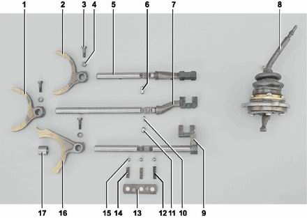 Детали привода переключения передач: 1 - вилка включения III-й и IV-й передач (2101-1702024); 2 - вилка включения I-й и II-й передач (2101-1702024); 3 - болт крепления вилки (2101-1702028); 4 - шайба пружинная 6 (10516470); 5 - шток вилки включения I-й и II-й передач (2107-1702060); 6 - сухарь (2101-1702107); 7 - шток вилки включения III-й и IV-й передач (2107-1702071); 8 - рычаг переключения с механизмом выбора передач (2107-1703080); 9 - шток вилки включения V передачи и передачи заднего хода (2107-1702080); 10 - сухарь (2101-1702108); 11 - сухарь (2101-1702109); 12 - пружина фиксатора штока V передачи и передачи заднего хода (2108-1702087); 13 - крышка фиксаторов штоков с прокладкой (2101-1702090); 14 - пружины фиксаторов штоков (2101-1702087); 15 - шариковые фиксаторы (2101-1702077); 16 - вилка включения V-й передачи и передачи заднего хода (2107-1702028); 17 - втулка дистанционная (2101-1702084-10)Привод переключения передач - механический. Он состоит из рычага переключения передач, механизма выбора передач, трех штоков с вилками, фиксаторов и замкового устройства. К верхней части рычага на резьбе крепится рукоятка. Стержень рычага соединяется с его нижней частью через эластичные втулки демпфера, которые поглощают вибрацию и обеспечивают мягкое включение передач. Корпус рычага в сборе с механизмом выбора передач и корпусом шаровой опоры закреплен сверху на шпильках задней крышки тремя гайками. Сферическая часть рычага подвижно установлена в корпусе шаровой опоры. Нижняя часть рычага заходит в паз одного из штоков. Рычаг, поворачиваясь в шаровой опоре, воздействует на шток, перемещая его и вилку, закрепленную неподвижно на штоке. Шток вилки включения I-й и II-й передач и шток вилки включения III-й и IV-й передач подвижно установлены в отверстиях передней и задней стенки картера. Шток вилки включения V-й передачи и передачи заднего хода установлен в отверстии, выполненном в приливе задней стенки картера. Штоки удерживаются в нейтральном или включенном положениях шариковыми подпружиненными фиксаторами, для которых в каждом штоке выполнено по три гнезда. Фиксаторы с пружинами расположены во втулках, запрессованных в отверстиях картера и закрытых общей крышкой. Для исключения одновременного включения нескольких передач (перемещения штоков) привод имеет замковое устройство, состоящее из трех сухарей, расположенных в отверстиях штока III-й и IV-й передач и задней стенки картера. Задняя крышка установлена на шести шпильках и закреплена гайками с пружинными шайбами. Ha левой стороне задней крышки закреплен привод спидометра, ведомая шестерня которого входит в зацепление с винтовой шестерней привода, установленной на шлицах задней шейки вторичного вала. Первичный вал изготовлен заодно с косозубой шестерней постоянного зацепления. Ha задний поясок вала напрессован, а затем приварен прямозубый венец синхронизатора IV-й передачи. Ha венце IV-й передачи установлено подпружиненное блокирующее кольцо синхронизатора, закрепленное стопорным кольцом. Зубья внутреннего венца кольца синхронизации заходят в зацепление с зубьями синхронизатора IV-й передачи. Ha передней части вала выполнены шлицы, на которых расположен ведомый диск сцепления. Вал вращается в двух шариковых подшипниках; передний расположен в торце коленчатого вала, а задний - в передней стенке картера коробки передач. Установочное кольцо в канавке внешнего кольца заднего подшипника предотвращает осевое смещение вала. Вторичный в
