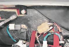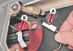 10. Торцовым ключом на 21 мм отворачиваем гайку крепления гидрокорректора и выталкиваем его внутрь панели приборов. 11. Отсоединяем от плафона освещения вещевого ящика колодку проводов A и разъединяем "массовый" провод Б.