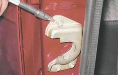 2. Выколоткой выбиваем вверх из петель кузова палец ограничителя открывания двери и плоскогубцами извлекаем палец.