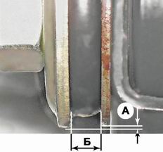 Передняя подвеска - проверка технического состоянияПериодически проверяем состояние передней подвески (см. "Периодическое техническое обслуживание"). Работы, связанные с проверкой или ремонтом элементов подвески, удобнее выполнять на смотровой яме или эстакаде с помощником. Оцениваем состояние резинометаллических шарниров, защитных чехлов шаровых опор, подушек стабилизатора поперечной устойчивости, наличие деформаций рычагов и их осей. Шаровые опоры с порванными защитными чехлами рекомендуется заменить в сборе (см. "Шаровые опоры - замена"). Порванные, потрескавшиеся или имеющие разбитые отверстия подушки стабилизатора - заменяем (см. "Подушки и штанга стабилизатора поперечной устойчивости - замена"). Проверяем состояние амортизаторов и пружин, а также затяжку резьбовых соединений деталей подвески. Проверка резинометаллических шарниров рычагов подвески При одностороннем износе или разрыве резинометаллические шарниры необходимо заменить. Износ шарниров является одной из причин, из-за которой невозможна регулировка угла развала колес, когда удалены все шайбы из-под оси нижнего рычага. 1. Подготавливаем автомобиль к выполнению операций (см. "Подготовка автомобиля к TO и ремонту"). 2. Измеряем радиальное смещение A упорной шайбы шарнира относительно торца наружной втулки и расстояние Б между внутренними торцами упорной шайбы и наружной втулки.