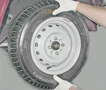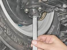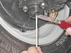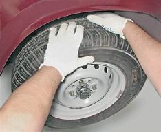 7. Проверяем наличие осевого люфта в подшипниках ступицы переднего колеса. Вывесив колесо и взявшись за него в вертикальной плоскости, поочередно резкими движениями верхней части колеса на себя, а нижней - от себя определяем наличие люфта.