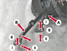Положения подрулевого переключателя указателей поворота A: 0 - указатели поворота выключены; I - включены указатели правого поворота; II - включены указатели левого поворота. Положения подрулевого переключателя света фар при третьем фиксированном положении выключателя B наружного освещения. Ключ в замке зажигания находится в положении "Зажигание" или "Стоянка": 0 - включено наружное освещение и ближний свет фар; I - включено наружное освещение и дальний свет фар; II - включен дальний свет фар (нефиксированное положение).