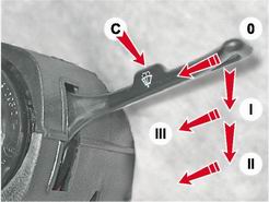 Положения подрулевого переключателя стеклоочистителя C: 0 - стеклоочиститель ветрового стекла выключен; I - стеклоочиститель ветрового стекла работает в прерывистом режиме; II - стеклоочиститель ветрового стекла работает непрерывно; III - включается омыватель ветрового стекла, а при включенном свете фар одновременно включаются стеклоочистители и омыватели блок-фар. |
