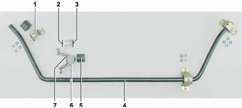 Подушки и штанга стабилизатора поперечной устойчивости - заменаСтабилизатор поперечной устойчивости снимаем при деформации штанги или замене всех резиновых подушек кронштейнов ее крепления. Резиновые подушки обойм крепления штанги стабилизатора к рычагам заменяем, не снимая самой штанги.