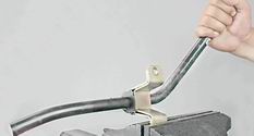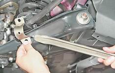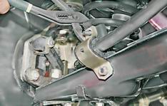6. Торцовым ключом на 13 мм с удлинителем отворачиваем две гайки крепления кронштейна стабилизатора к лонжерону кузова. 7. Аналогично отворачиваем гайки крепления второго кронштейна и снимаем стабилизатор. Очищаем штангу стабилизатора от грязи. 8. Для замены подушки кронштейна стабилизатора зажимаем кронштейн в тисках. Если штанга стабилизатора не требует замены, то помечаем положение подушек кронштейна относительно штанги стабилизатора для облегчения последующей сборки. Смазываем мыльным раствором штангу стабилизатора для облегчения снятия кронштейна с подушкой. 9. Поворачивая штангу стабилизатора в разные стороны, вытягиваем ее из подушки кронштейна.