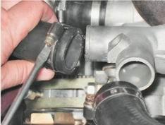 9. Отворачиваем гайку верхнего крепления теплозащитного экрана стартера (см. "Стартер - снятие и установка") 10. Снимаем со шпильки выпускного коллектора наконечник "массового" провода (см. "Прокладка впускного трубопровода и выпускного коллектора впрыскового двигателя - замена"). 11. Отсоединяем колодки проводов от датчика положения дроссельной заслонки (см. "Датчик положения дроссельной заслонки - проверка и замена") и датчика температуры охлаждающей жидкости (см. "Датчик температуры охлаждающей жидкости - проверка и замена"). 12. Отсоединяем колодку проводов от регулятора холостого хода (см. "Регулятор холостого хода - проверка, снятие и установка") и колодку жгута проводов форсунок от моторного жгута (см. "Топливная рампа - снятие, установка и проверка форсунок"). 13. Снимаем трос привода дроссельной заслонки с сектора корпуса (см. "Корпус дроссельной заслонки - снятие и установка") и, отвернув два болта крепления кронштейна, отводим в сторону кронштейн с тросом (см. "Ресивер - снятие и установка"). 14. Ослабив затяжку хомутов, снимаем перепускной шланг термостата и подводящий шланг радиатора.