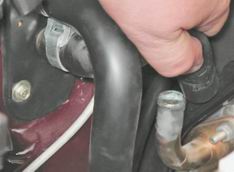 15. Ослабив затяжку хомута, снимаем с патрубка шланг подвода охлаждающей жидкости к радиатору отопителя.