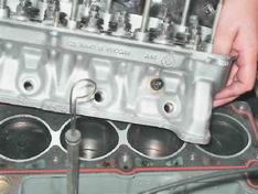 Прокладка головки блока цилиндров впрыскового двигателя - заменаГоловку блока цилиндров снимаем, не отсоединяя ресивера, впускного трубопровода и выпускного коллектора. Для выполнения работы потребуется динамометрический ключ. Снятие 1. Устанавливаем автомобиль на смотровую яму или эстакаду (см. "Подготовка автомобиля к TO и ремонту"). 2. Для удобства проведения работы снимаем аккумуляторную батарею (см. "Аккумуляторная батарея - снятие и установка"). 3. Сливаем охлаждающую жидкость (см. "Охлаждающая жидкость - проверка уровня и замена"). 4. Отсоединяем наконечник провода от датчика указателя температуры охлаждающей жидкости (см. "Датчик указателя температуры охлаждающей жидкости - замена"). 5. Выворачиваем из головки блока цилиндров свечи зажигания (см. "Свечи зажигания - проверка состояния и замена"). 6. Снимаем приемную трубу со шпилек выпускного коллектора (см. "Приемная труба - снятие и установка"). 7. Устанавливаем поршень 4-го цилиндра в положение BMT такта сжатия и снимаем корпус в сборе с распределительным валом, рычаги приводов клапанов и пружины (см. "Распределительный вал и рычаги клапанов - замена"). 8. Подвязываем проволокой цепь и пропускаем через окно в головке блока цилиндров.