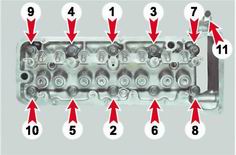 3. Затягиваем болты крепления головки блока в четыре приема: - предварительно затягиваем десять болтов внутреннего крепления головки моментом 20 Н·м; - подтягиваем их моментом 69,4-85,7 Н·м. - доворачиваем болты на 90°; - снова доворачиваем болты на 90°. Последним затягиваем болт наружного крепления (11) моментом 30,6-39,1 Н·м.