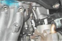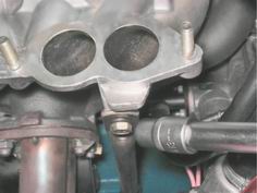 16. Снимаем со шпилек шайбы. Под гайками совместного крепления впускного трубопровода и выпускного коллектора установлены шайбы увеличенной толщины. 17. Отведя выпускной коллектор от головки блока цилиндров, снимаем впускной трубопровод со шпилек.
