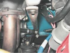 7. Ослабляем затяжку нижней гайки крепления передней растяжки к шпильке кронштейна правой опоры силового агрегата и отводим растяжку в сторону.