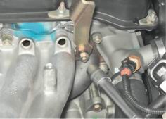 Прокладка впускного трубопровода и выпускного коллектора впрыскового двигателя - заменаСнятие 1. Устанавливаем автомобиль на смотровую яму или эстакаду (см. "Подготовка автомобиля к TO и ремонту"). 2. Для удобства проведения работы снимаем аккумуляторную батарею (см. "Аккумуляторная батарея - снятие и установка"). 3. Сливаем охлаждающую жидкость (см. "Охлаждающая жидкость - проверка уровня и замена"). 4. Снимаем топливную рампу (см. "Топливная рампа - снятие, установка и проверка форсунок"). 5. Отворачиваем две гайки и болт крепления щитка стартера и снимаем щиток со шпилек выпускного коллектора (см. "Стартер - снятие и установка"). 6. Торцовым ключом на 13 мм отворачиваем болты верхнего крепления передней и задней растяжек к впускному трубопроводу.