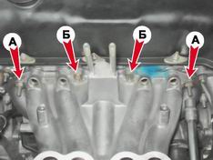 11. Торцовым ключом на 13 мм с глубокой головкой отворачиваем две гайки A совместного крепления впускного трубопровода с выпускным коллектором и две гайки Б крепления впускного трубопровода.