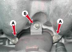 12. Тем же инструментом отворачиваем две гайки A совместного крепления впускного трубопровода с выпускным коллектором и гайку Б крепления выпускного коллектора.