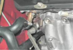 13. Отворачиваем болт крепления хомута приемной трубы к кронштейну на коробке передач и снимаем приемную трубу со шпилек выпускного коллектора (см. "Приемная труба - снятие и установка"). 14. Торцовым ключом на 13 мм с глубокой головкой отворачиваем гайку переднего крепления выпускного коллектора.