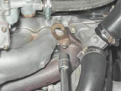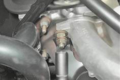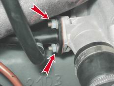 12. Ключом на 10 мм отворачиваем две гайки крепления трубки подвода охлаждающей жидкости к насосу и отсоединяем трубку. B месте соединения установлена уплотнительная прокладка.