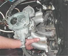 Прокладки впускного трубопровода и выпускного коллектора карбюраторного двигателя - заменаСнятие 1. Устанавливаем автомобиль на смотровую яму или эстакаду (см. "Подготовка автомобиля к TO и ремонту"). 2. Сливаем охлаждающую жидкость (см. "Охлаждающая жидкость - проверка уровня и замена"). 3. Снимаем приемную трубу со шпилек выпускного коллектора (см. "Приемная труба - снятие и установка"). 4. Снимаем корпус воздушного фильтра (см. "Корпус воздушного фильтра - снятие и установка"). 5. Отсоединяем от карбюратора тягу привода воздушной заслонки и поперечную тягу привода дроссельной заслонки (см. "Карбюратор - снятие и установка"). 6. Для удобства проведения работы снимаем аккумуляторную батарею (см. "Аккумуляторная батарея - снятие и установка"). 7. Торцовым ключом на 13 мм отворачиваем гайку нижнего крепления воздухозаборника.