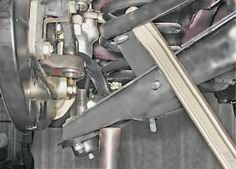 2. Устанавливаем пружину на опорную чашку нижнего рычага и ориентируем пружину так, чтобы ее торец совпал с винтовой поверхностью опорной чашки рычага. 3. Подставляем домкрат под нижний рычаг и приподнимаем его, следя за тем, чтобы резиновая прокладка установилась на верхней опорной чашке. 4. Приподнимаем рычаг домкратом и направляем палец нижней шаровой опоры в отверстие поворотного кулака. 5. Заворачиваем на 4-5 оборотов самоконтрящуюся гайку крепления пальца. Ослабляем стяжки и извлекаем их через технологическое отверстие в нижнем рычаге.