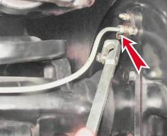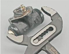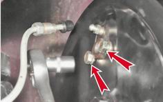 Внимание! Если штуцер "прикипел" к трубке и отвернуть его не удается, попробуйте (после выполнения п. 6) отвернуть цилиндр, удерживая штуцер специальным ключом для тормозных трубок на 10 мм. При таком способе снятия цилиндра тормозную трубку необходимо заменить новой. 5. Для уменьшения потерь тормозной жидкости надеваем на конец трубки защитный колпачок (от штуцера прокачки тормозного цилиндра). 6. Торцовым ключом на 10 мм отворачиваем два болта крепления рабочего цилиндра и снимаем его.