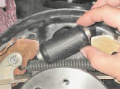 7. Повернув цилиндр относительно отверстия в тормозном щите, выводим упоры цилиндра из зацепления с тормозными колодками.
