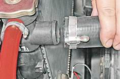 Радиатор - снятие и установкаСнятие 1. Устанавливаем автомобиль на смотровую яму или эстакаду (см. "Подготовка автомобиля к TO и ремонту"). 2. Сливаем жидкость из системы охлаждения (см. "Охлаждающая жидкость - проверка уровня и замена"). 3. Снимаем электровентилятор (см. "Электровентилятор радиатора - снятие и установка"). 4. Ослабив хомут, снимаем подводящий шланг с верхнего патрубка радиатора.