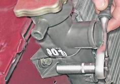 5. Отсоединяем от патрубка заливной горловины радиатора соединительный шланг (см. "Расширительный бачок - замена"). 6. Отсоединяем от входного патрубка термостата отводящий шланг радиатора (см. "Термостат - замена"). 7. Торцовым ключом на 10 мм отворачиваем болт крепления радиатора с левой стороны.
