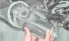 Редуктор заднего моста - снятие и установкаРедуктор снимаем при необходимости его ремонта или замены. Снятие 1. Устанавливаем автомобиль на смотровую яму или эстакаду (см. "Подготовка автомобиля к TO и ремонту"). 2. Сливаем масло из заднего моста (см. "Задний мост - проверка уровня и замена масла"). 3. Отсоединяем карданный вал от фланца хвостовика ведущей шестерни (см. "Карданная передача - снятие и установка"). 4. Снимаем полуоси (см. "Полуось - снятие и установка, замена сальника"). 5. Торцовым ключом на 12 мм отворачиваем восемь болтов крепления редуктора к балке заднего моста.