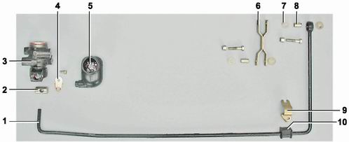 Детали привода регулятора давления: 1 - рычаг привода регулятора (2101-3512122); 2 - ось рычага (2101-3512116); 3 - регулятор давления (2101-3512010); 4 - стопорная пластина рычага (2101-3512117); 5 - защитный чехол (2101-3512118); 6 - тяга рычага привода (2101-3512132); 7 - втулка полимерная стойки рычага (2101-3512136); 8 - втулка распорная (2101-3512135); 9 - скоба крепления рычага (2101-3512128); 10 - втулка рычага привода (2101-3512125)Для выполнения работы потребуется помощник, а также специальный ключ на 10 мм для тормозных трубок, прозрачная виниловая трубка подходящего диаметра, емкость для слива тормозной жидкости, свежая тормозная жидкость (см. "Эксплуатационные жидкости"). Проверка 1. Устанавливаем автомобиль на смотровую яму или эстакаду (см. "Подготовка автомобиля к TO и ремонту"). 2. Очищаем от грязи регулятор и защитный чехол. 3. Снимаем с регулятора резиновый защитный чехол и удаляем смазку в месте контакта поршня с осью рычага. 4. Помощник нажимает на педаль тормоза с усилием 70-80 кгс, в этот момент наблюдаем за перемещением выступающей части поршня регулятора. Если перемещение поршня относительно корпуса регулятора составляет 0,5-0,9 мм, то регулятор исправен. Если при нажатии на педаль поршень не перемещается - заменяем регулятор давления. 5. Убеждаемся в отсутствии подтекания тормозной жидкости между корпусом регулятора и поршнем. 6. Наносим водостойкую смазку на конец рычага и выступающую часть поршня и закладываем 5-6 г этой же смазки в резиновый чехол. 7. Устанавливаем чехол на регулятор давления. Снятие Для удобства выполнения работы отсоединяем от кронштейна заднего моста правый амортизатор и отводим его в сторону (см. "Амортизатор задней подвески - замена"). 1. Торцовым ключом на 10 мм отворачиваем гайку болта крепления рычага привода регулятора давления к тяге, удерживая болт от проворачивания ключом того же размера.