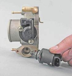 3. Снимаем регулятор холостого хода. B соединении регулятора и корпуса дроссельной заслонки установлено уплотнительное кольцо. Потерявшее эластичность или потрескавшееся кольцо заменяем.