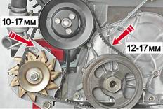 Ремень привода генератора - регулировка натяжения и заменаДля выполнения работы потребуется линейка. Последовательность выполнения Натяжение ремня характеризуется величиной прогиба на участке между шкивами насоса охлаждающей жидкости и коленчатого вала или шкивами насоса и генератора при приложении усилия 10 кгс в середине участка. B первом случае прогиб должен составлять 12-17 мм, а во втором - 10-15 мм. Визуально оцениваем состояние ремня. При наличии отслоений, надрывов и других механических повреждений заменяем ремень (см. ниже). 1. Подготавливаем автомобиль к выполнению операций (см. "Подготовка автомобиля к TO и ремонту"). 2. Для проверки натяжения ремня большой отверткой или другим подходящим предметом нажимаем на ветвь ремня в одном из двух мест (показаны стрелками) и проверяем прогиб.