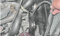 3. Если прогиб не соответствует указанным значениям, то ослабляем гайку крепления генератора к регулировочной планке (см. "Генератор - снятие и установка"). 4. Монтажной лопаткой отжимаем генератор от блока цилиндров, увеличивая натяжение ремня. Если для этого требуется чрезмерное усилие, то, сняв грязезащитный щиток двигателя (см. "Грязезащитный щиток - снятие и установка"), ключом на 19 мм (на 13 мм для генератора 9412.3701) ослабляем гайку крепления генератора к кронштейну двигателя (см. "Генератор - снятие и установка"). Удерживая генератор, затягиваем гайку крепления генератора к регулировочной планке. Проверяем прогиб ремня, при необходимости подтягиваем или ослабляем его натяжение. Внимание! Чрезмерное натяжение ремня вызывает повышенные нагрузки на подшипники насоса охлаждающей жидкости и генератора, что приведет к преждевременному выходу их из строя. 5. Для замены ремня ослабляем гайку крепления генератора к регулировочной планке и монтажной лопаткой перемещаем до упора генератор к блоку цилиндров (см. выше). 6. У впрыскового двигателя для снятия ремня снимаем датчик положения коленчатого вала (см. "Датчик положения коленчатого вала - проверка и замена"). 7. Снимаем ремень со шкивов и устанавливаем новый.