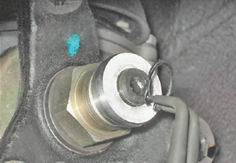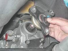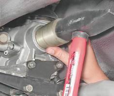 Для наглядности следующую операцию показываем на снятой коробке передач. 2. Молотком напрессовываем на вал фланец. Установив шайбу, наносим на резьбовую поверхность вала фиксирующий клей (согласно инструкции по применению) и заворачиваем гайку.