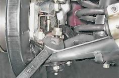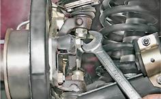 12. Отворачиваем гайку крепления нижнего шарового пальца. 13. Ключом на 13 мм отворачиваем три гайки крепления нижней шаровой опоры к рычагу.