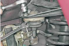 9. Снимаем верхнюю шаровую опору с прижимной пластиной и чехлом. 10. Для снятия нижней шаровой опоры рожковым ключом на 22 мм отворачиваем на 4-5 оборотов гайку крепления шарового пальца.