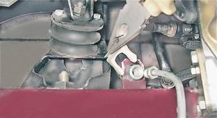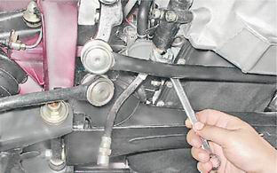 Шланг гидропривода выключения сцепления - снятие и установкаСнятие 1. Устанавливаем автомобиль на смотровую яму или эстакаду (см. "Подготовка автомобиля к TO и ремонту"). 2. Сливаем жидкость из гидропривода выключения сцепления (см. "Гидропривод выключения сцепления - замена жидкости и прокачка"). 3. Отсоединяем резиновый хомут крепления расширительного бачка охлаждающей жидкости и отодвигаем бачок в сторону (см. "Расширительный бачок - замена"). 4. Рожковым ключом на 13 мм отворачиваем штуцер трубопровода, удерживая от проворачивания наконечник тормозного шланга рожковым ключом на 17 мм. Оттягиваем трубопровод немного вверх и отводим его в сторону.